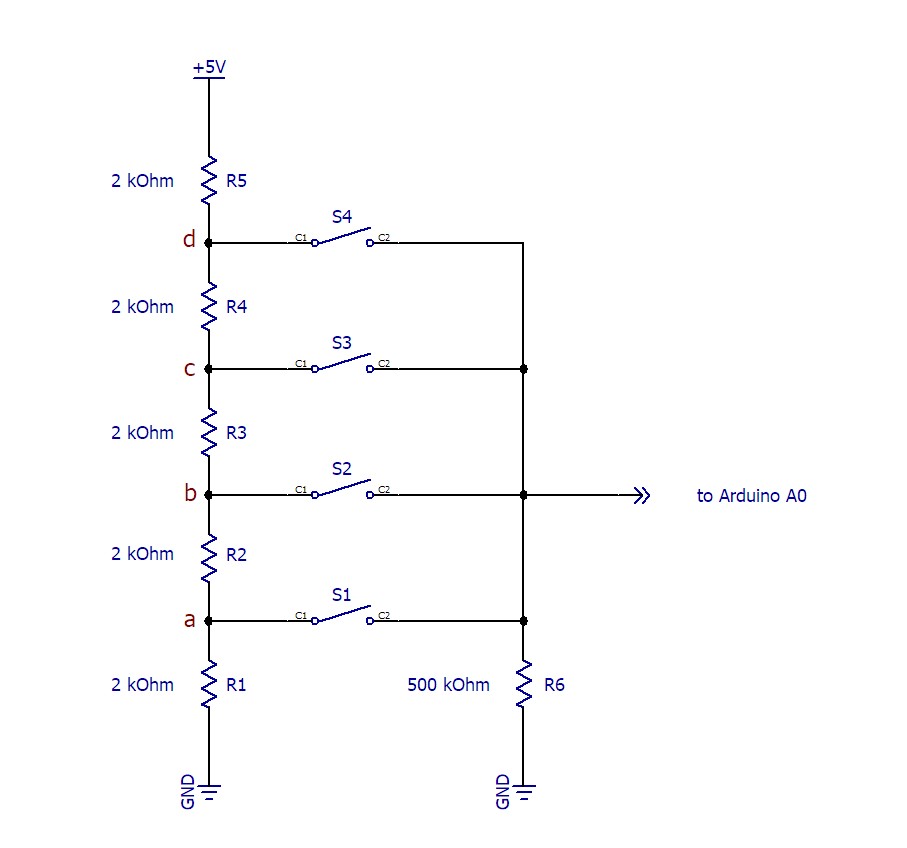 Five 2-kilo ohm resistors form a voltage divider circuit. One end of the resistor network is connected to the supply voltage, and the other end is to the ground. Each junction between the resistors is connected to a button, and the other side of the buttons is connected together as input for the analog port.