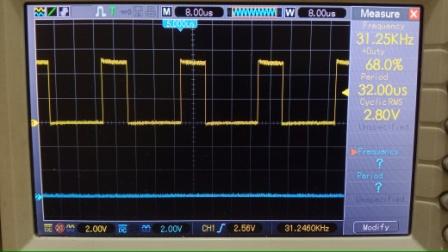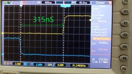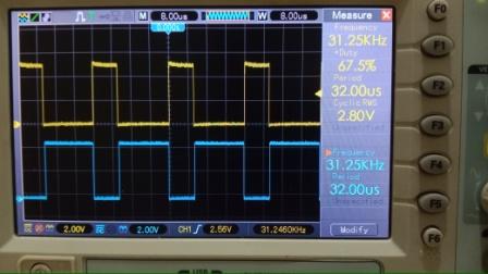 TCCR1A = 0b10110000; // Sync Boost ( OC1A & OC1B enable)The dead-time I obtained is approximately 315 nS, which is quite close to the expected value of 312.5 nS. The picture below illustrates the dead time, which is the period during which both signals are logic LOW.